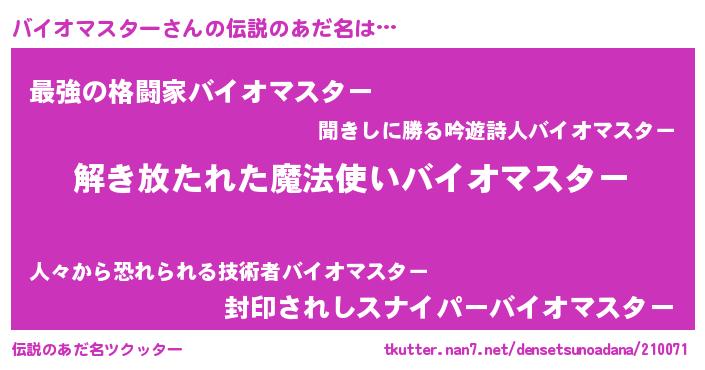 | 意味不明あだ名 | 『とにかく怪しいバイオマスター』 |