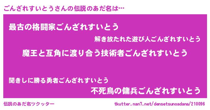 | 男性向けラノベタイトル風あだ名 | 『冴えないごんざれすいとうの育てかた』 |