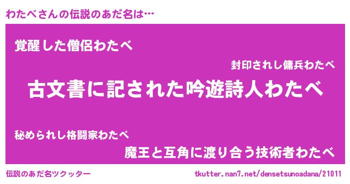 | 女子向けラノベタイトル風あだ名 | 『わたべの玉の輿計画!』『闇のわたべ』 |