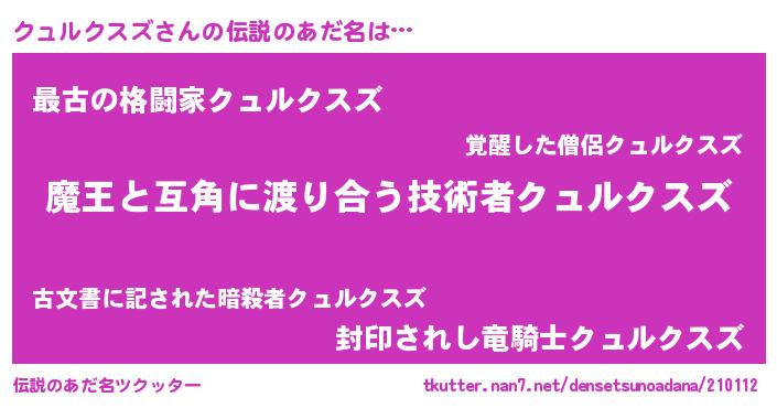 | ファンタジー風あだ名 | 『カーククュラー』『ゼクュトゥ』 |