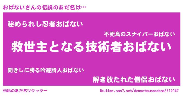 | 男性向けラノベタイトル風あだ名 | 『Re:おばないから始める異世界生活』 |