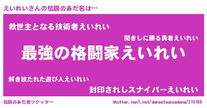 | 男性向けラノベタイトル風あだ名 | 『Re:えいれいから始める異世界生活』 |