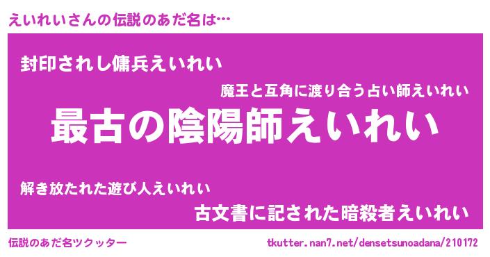 | 意味不明あだ名 | 『自称えいれい』『めかぶ科えいれい属』 |