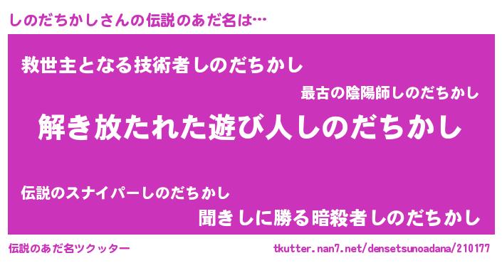 | 意味不明あだ名 | 『住所不定無職しのだちかし(98歳)』 |