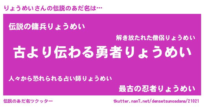 | ヒーロー風カッコイイあだ名 | 『ネオリョウメイ』『スーパーリョウメイ』 |