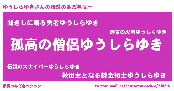 | ヒーロー風カッコイイあだ名 | 『黄金騎士ユウ』『ネオユウシラユキ』 |