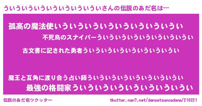 | 意味不明あだ名 | 『住所不定無職ういういういういういういういうい(71歳)』 |