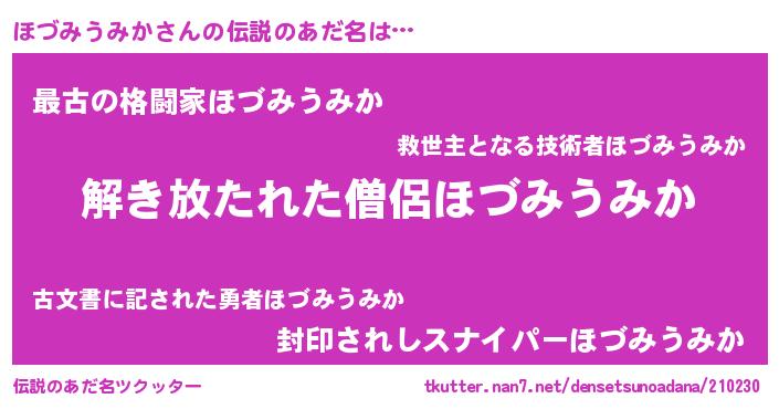 | 欧米人風あだ名 | 『ウサインほづみうみか』 |