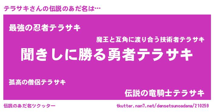 | 男性向けラノベタイトル風あだ名 | 『テラサキという概念が存在しない退屈な世界 』 |