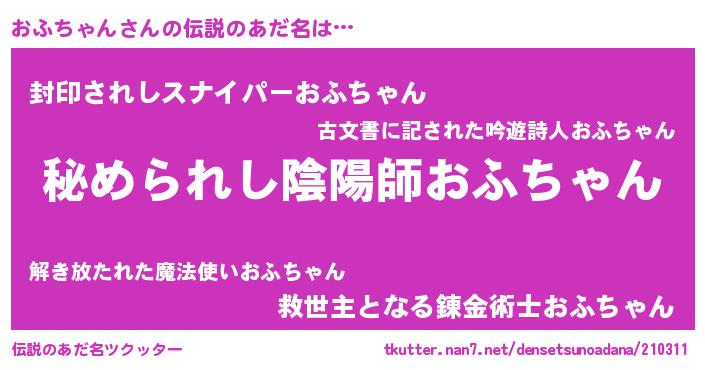| 意味不明あだ名 | 『住所不定無職おふちゃん(86歳)』 |