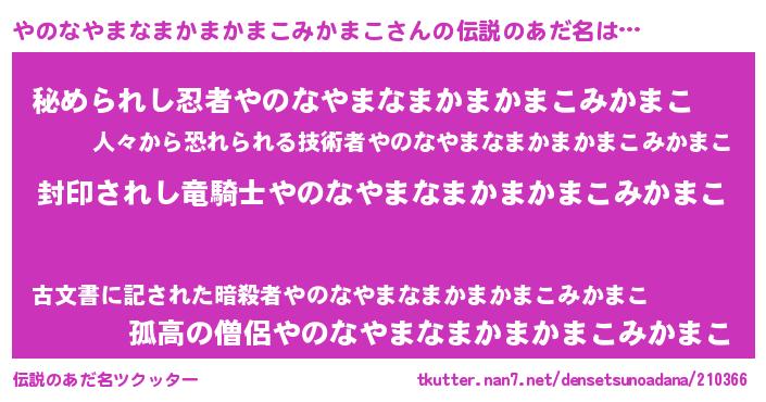 | 男性向けラノベタイトル風あだ名 | 『ヤノナヤマナマカマカマコミカマコアートオンライン』 |