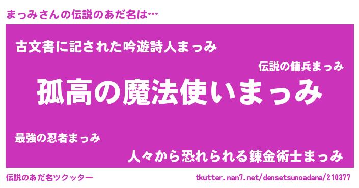 | 胡散臭い通販商品みたいなあだ名 | 『信頼と実績のサプリメント…その名も「まっみ」』 |