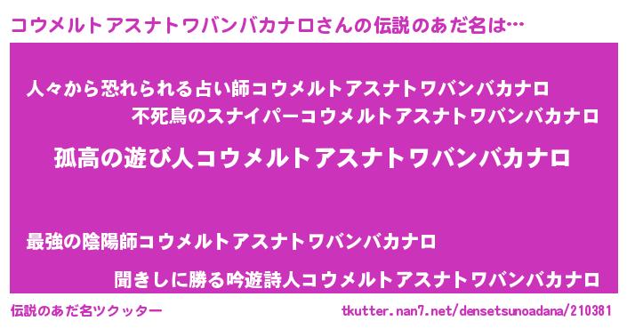 | 男性向けラノベタイトル風あだ名 | 『はたらくコウメルトアスナトワバンバカナロさま!』 |
