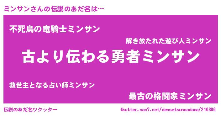 | 意味不明あだ名 | 『永久保存ミンサン』『ペロリンミンサン』 |
