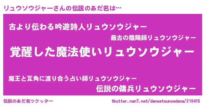| 意味不明あだ名 | 『住所不定無職リュウソウジャー(12歳)』 |