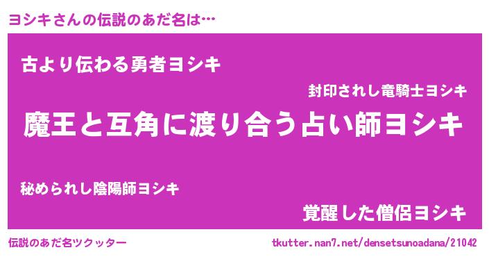 | ヒーロー風カッコイイあだ名 | 『愛の使者ヨシキ』『サイバー戦士ヨシキ』 |