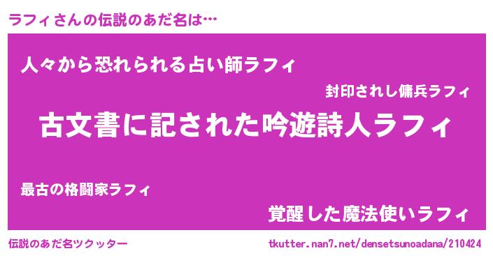 | 意味不明あだ名 | 『永久保存ラフィ』『めかぶ科ラフィ属』 |