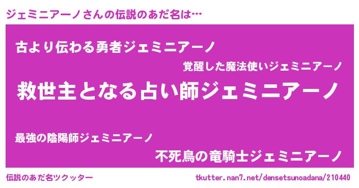 | 男性向けラノベタイトル風あだ名 | 『ジェミニアーノに滅ぼされるだけの簡単なお仕事です』 |