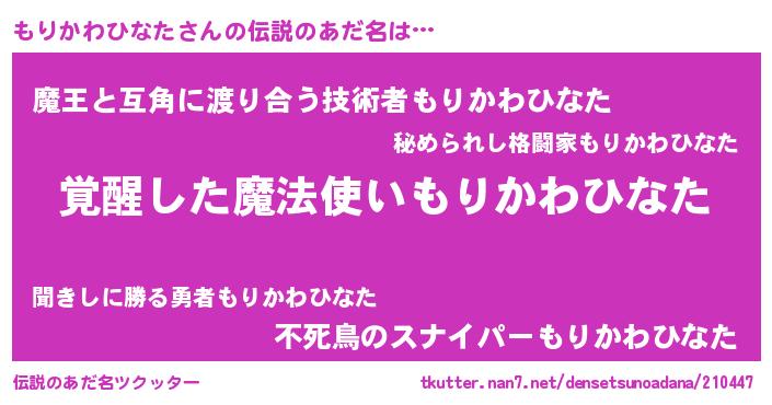 | 男性向けラノベタイトル風あだ名 | 『この素晴らしい世界にもりかわひなたを!』 |