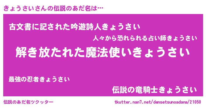 | 意味不明あだ名 | 『自称きょうさい』『永久保存きょうさい』 |