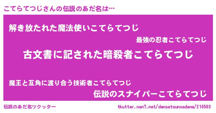 | ヒーロー風カッコイイあだ名 | 『究極戦士コテラテツジ』『黄金騎士コテ』 |