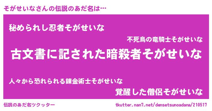 | 意味不明あだ名 | 『永久保存そがせいな』『自称そがせいな』 |
