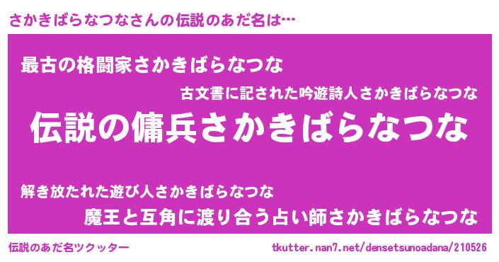 | 男性向けラノベタイトル風あだ名 | 『サカキバラナツナスレイヤー』 |