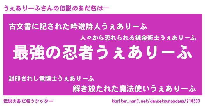 | 男性向けラノベタイトル風あだ名 | 『うちの娘の為ならば、俺はもしかしたらうぇありーふも倒せるかもしれない。』 |