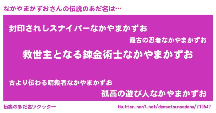 | 男性向けラノベタイトル風あだ名 | 『Re:なかやまかずおから始める異世界生活』 |