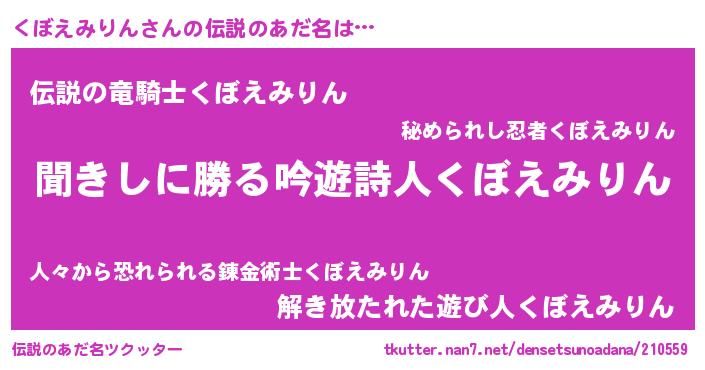 | 男性向けラノベタイトル風あだ名 | 『くぼえみりんという概念が存在しない退屈な世界 』 |