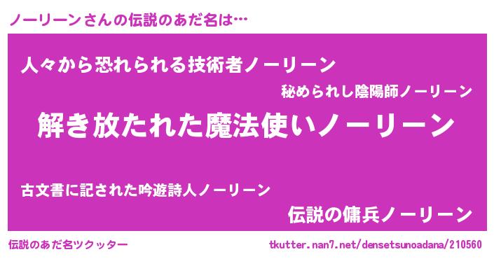 | ヒーロー風カッコイイあだ名 | 『魔戒騎士ノー』『天空の使者ノーリーン』 |