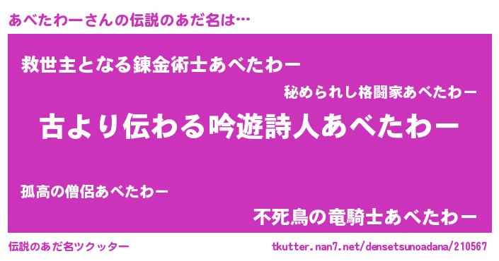 | 男性向けラノベタイトル風あだ名 | 『転生したらあべたわーだった件』 |