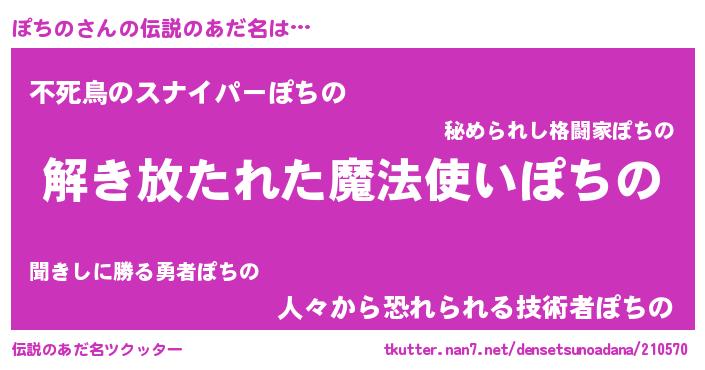 | 男性向けラノベタイトル風あだ名 | 『ダンジョンにぽちのを求めるのは間違っているだろうか』 |