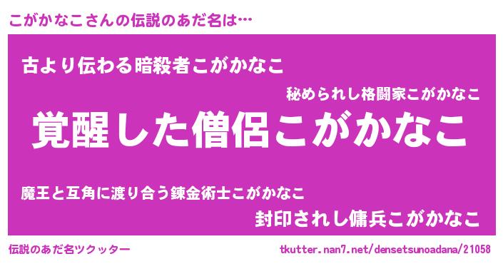 | 意味不明あだ名 | 『自称こがかなこ』『永久保存こがかなこ』 |