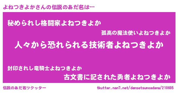 | 男性向けラノベタイトル風あだ名 | 『おまえをオタクにしてやるから、俺をよねつきよかにしてくれ! 』 |