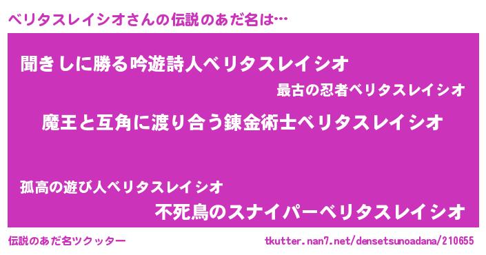 | 男性向けラノベタイトル風あだ名 | 『転生したらベリタスレイシオだった件』 |