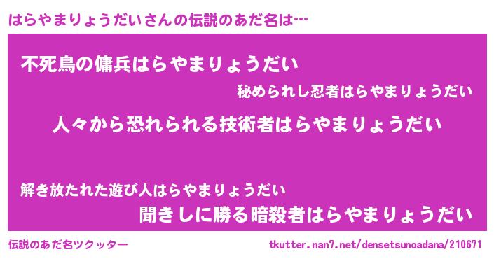 | ヒーロー風カッコイイあだ名 | 『正義の使者はらやまりょうだい』 |
