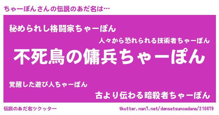 | 男性向けラノベタイトル風あだ名 | 『この素晴らしい世界にちゃーぽんを!』 |