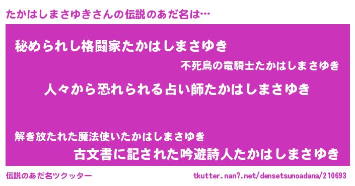 | 男性向けラノベタイトル風あだ名 | 『おまえをオタクにしてやるから、俺をたかはしまさゆきにしてくれ! 』 |