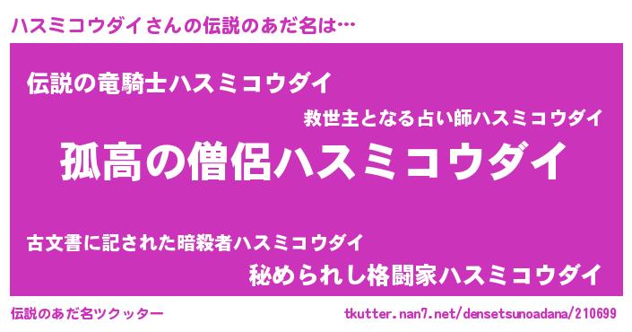 | 女子向けラノベタイトル風あだ名 | 『ハスミコウダイは平凡を望む』 |