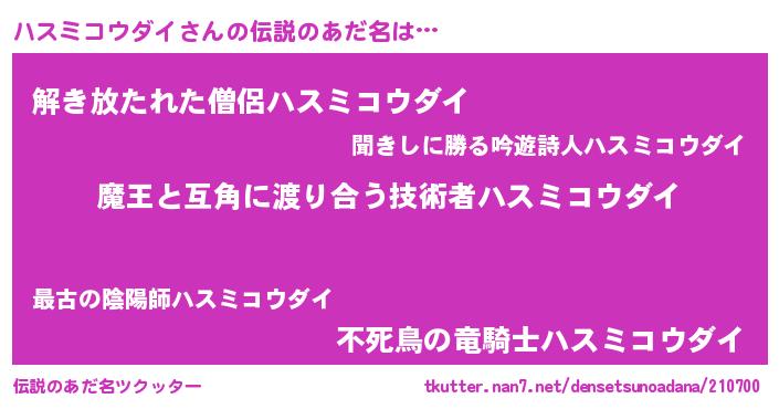 | 男性向けラノベタイトル風あだ名 | 『ハスミコウダイに滅ぼされるだけの簡単なお仕事です』 |