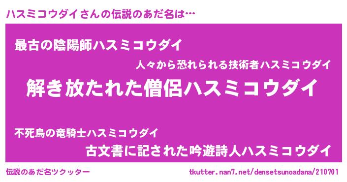 | ヒーロー風カッコイイあだ名 | 『銀牙騎士ハス』『ネオハスミコウダイ』 |