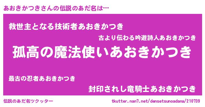| 胡散臭い通販商品みたいなあだ名 | 『信頼と実績のサプリメント…その名も「あおきかつき」』 |
