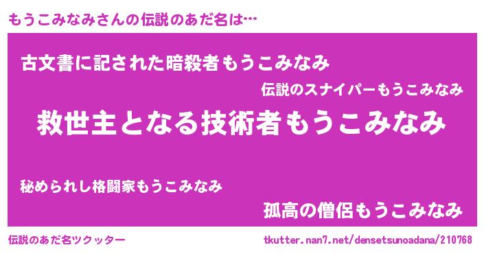| ヘコむあだ名 | 『もうこみなみ(小並感)』『もうっちょ』 |