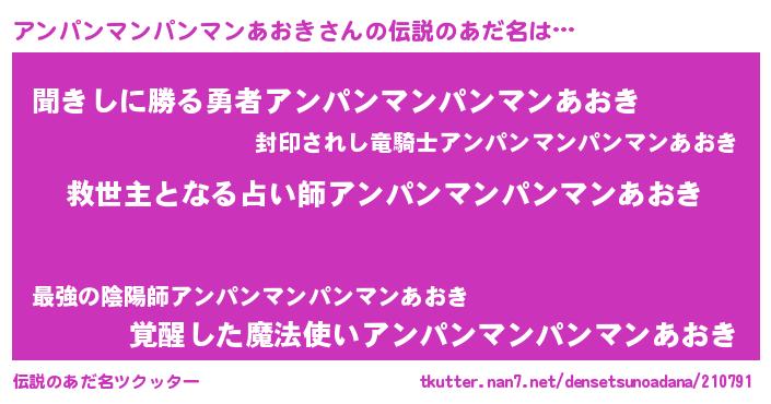 | 男性向けラノベタイトル風あだ名 | 『アンパンマンパンマンあおき~年齢イコール彼女いない歴の魔法使い~』 |