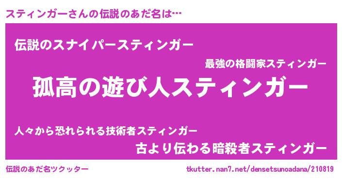 | 女子向けラノベタイトル風あだ名 | 『スティンガーが死なない童話 林檎のスティンガーの診療簿』 |