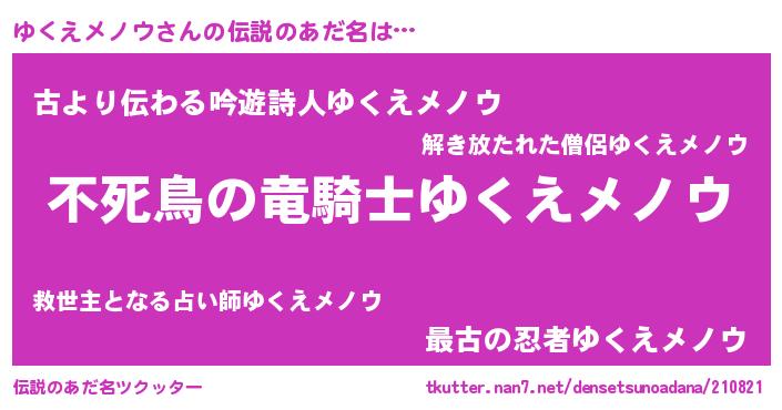 | ヘコむあだ名 | 『ゆくにー』『ゆくえメノウ(震え声)』 |