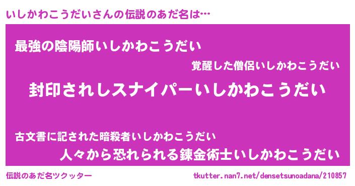 | 男性向けラノベタイトル風あだ名 | 『イシカワコウダイアートオンライン』 |