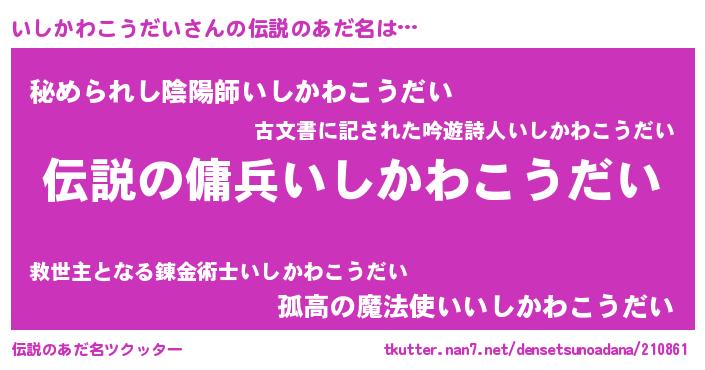 | 女子向けラノベタイトル風あだ名 | 『(仮)いしかわこうだいのやんごとなき事情』 |