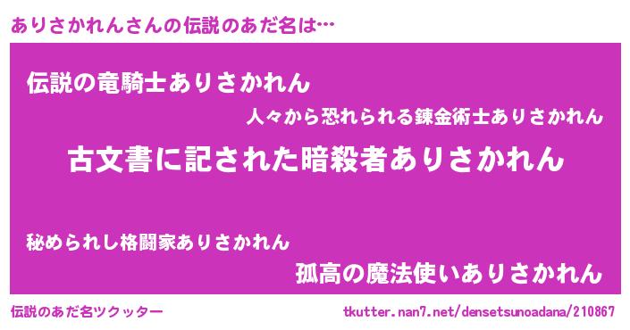 | 男性向けラノベタイトル風あだ名 | 『ありさかれん~年齢イコール彼女いない歴の魔法使い~』 |